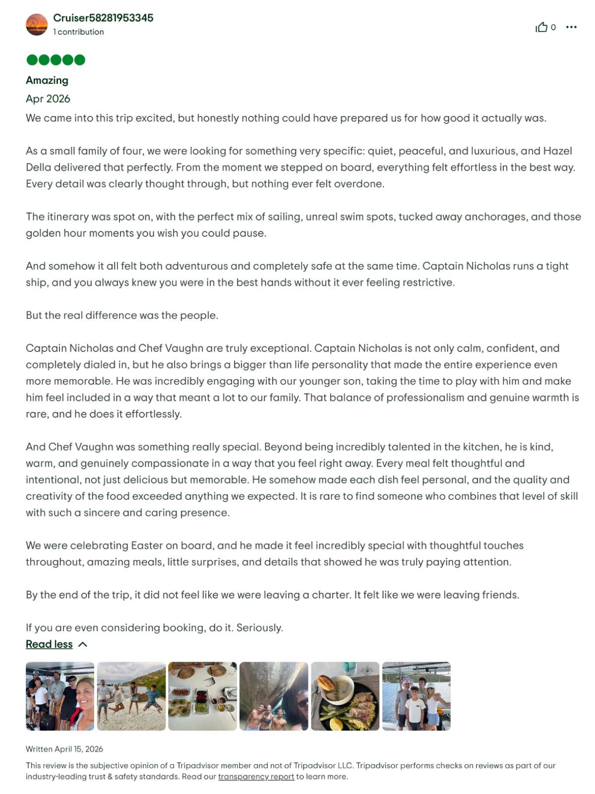 We just returned from a trip of a lifetime on the Hazel Della with Captain Nicholas and Chef D. To say it was amazing from the beginning to the end is an under statement. Captain Nicholas always made us feel safe and no request was too small or too big for him. I have no idea how Chef D created the delicious meals that she did in such a small space, but she truly has a gift. Both of them made us feel at home. The boat was beautiful and we would definitely sail on it again. I also want to give a shout out to Jared Hunsinger for all his help in putting this trip together.