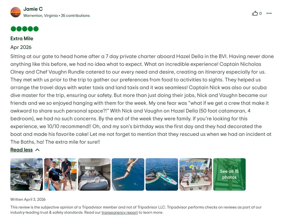 I have read a lot of the other reviews and there is nothing to add to them, it is simply a beautiful place in the BVIs. It’s magical and breathtaking and you must go on your own catamaran! What set this trip apart for us were our Captain (Nico) and Chef (Vaughn). They made the trip for us. I’m sure the scenery and experience are the same on most boats but you cannot replicate the feeling of spending the week with crew that become more like best friends. They made sure that we had the time of our lives on the Hazel Della and I cannot say enough about how magical they made this trip for me! As I told Nico when I gave them their tip, if I had brought double, I would have given that to them! They are spectacular and this yacht company is lucky to have these two men together on this boat. My only advice, only go if you want to relax and have a great time! These are the two that are made for that! It seems truly inadequate but thank you for the time of my life!