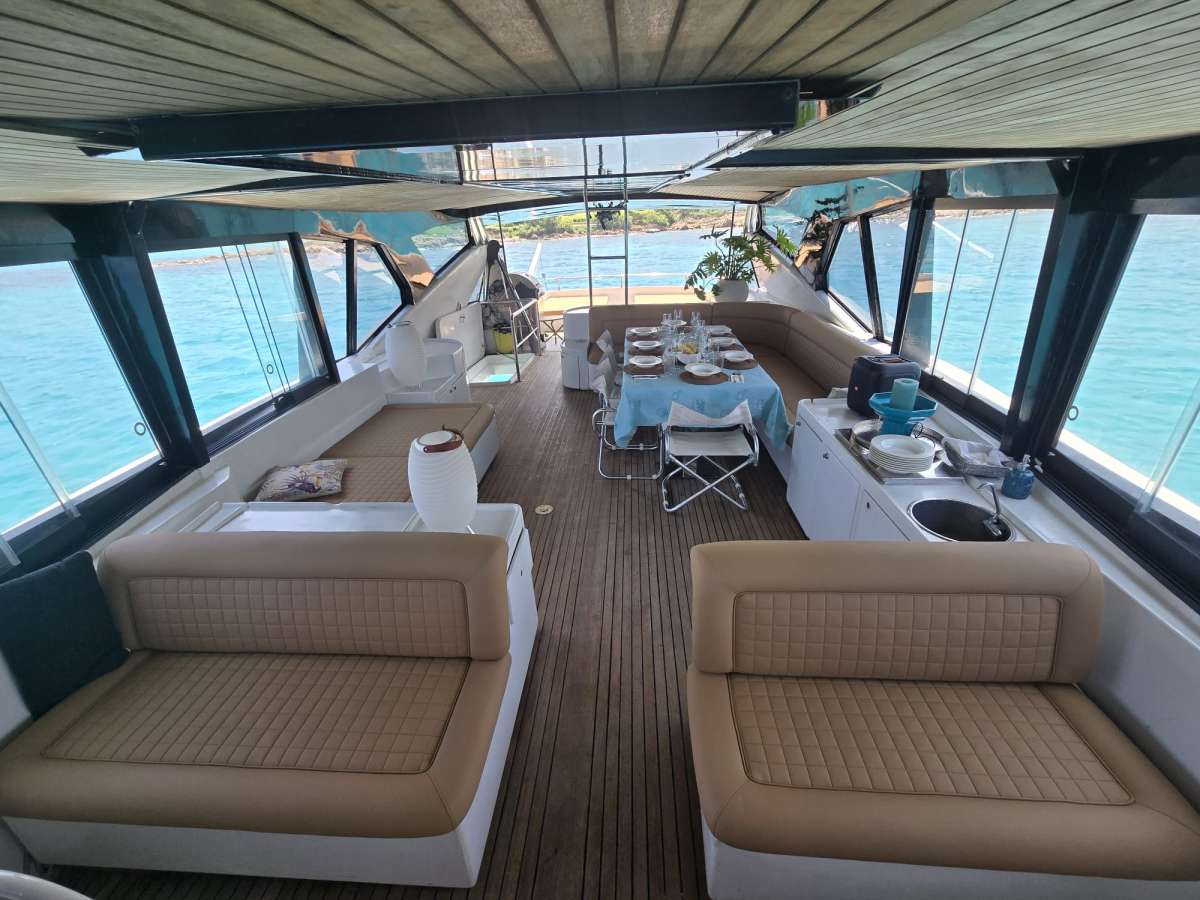 The beautiful Rizzardi Technema 80 Prime is an environmentally friendly yacht available on the charter market. Equipped with solar panels, hybrid engines and generators, she offers extremely low fuel consumption, ensuring guests a great stability and a pleasant navigation. She features a refined classic style that runs throughout her ample open decks where lounging in the sun or dining under the stars. Her interiors are furnished with light and natural tones enhanced with a typical nautical style. The wide salon, lined in fine wood and striped white/blue fabrics, holds a convertible sofa, a relaxing lounge area and a formal dining area. The lower deck is dedicated to night accommodation with 4 nice cabins for up to 10 guests: a master stateroom, a vip suite and two twins, both with additional pullman beds.