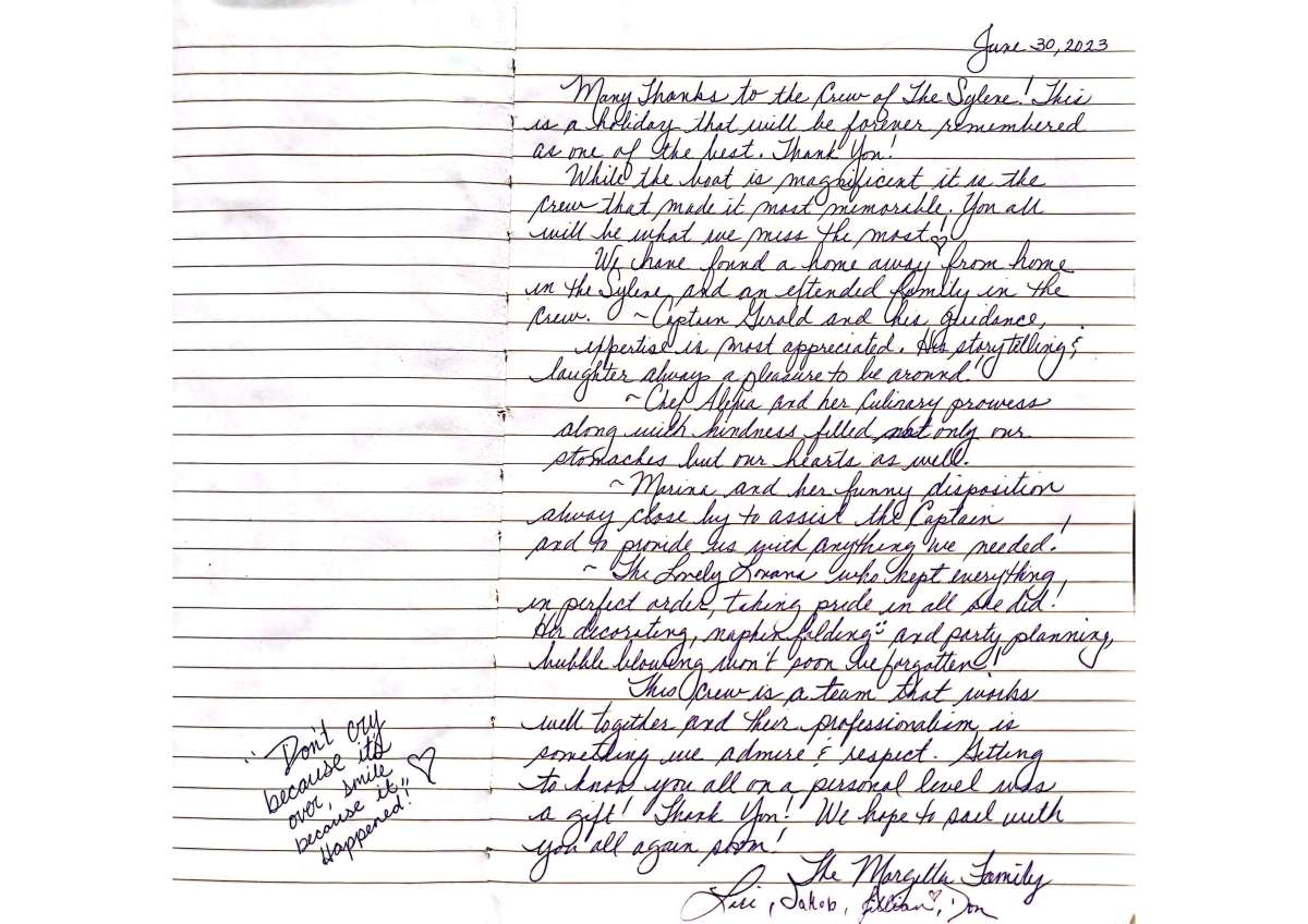 We have found a home away from homein the Sylene and an extended family in the crew. Captain Gerald and his guidance expertise is most appreciated. His story telling laughter alaways a pleasure to be around.