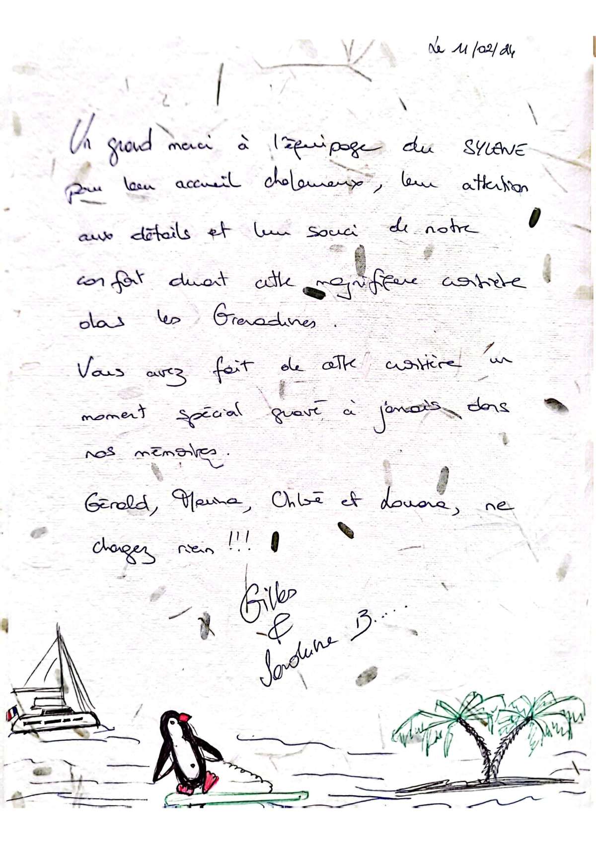 Un grand merci à l'équipage du SYLENE pour leur accueil chaleureux, leur attention aux détails et leur souci de notre confort durant cette magnifique croisière dans les Grenadines.