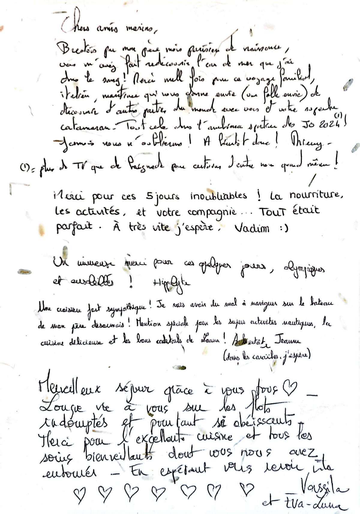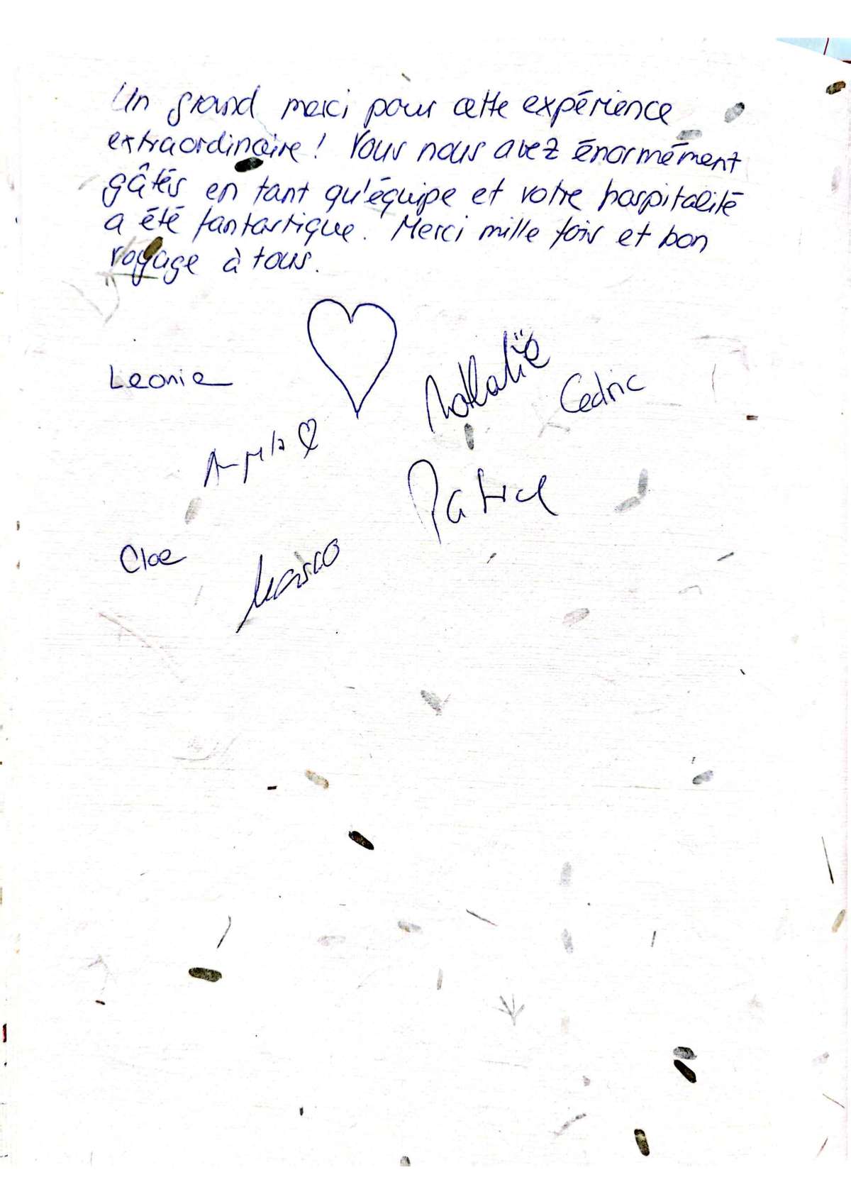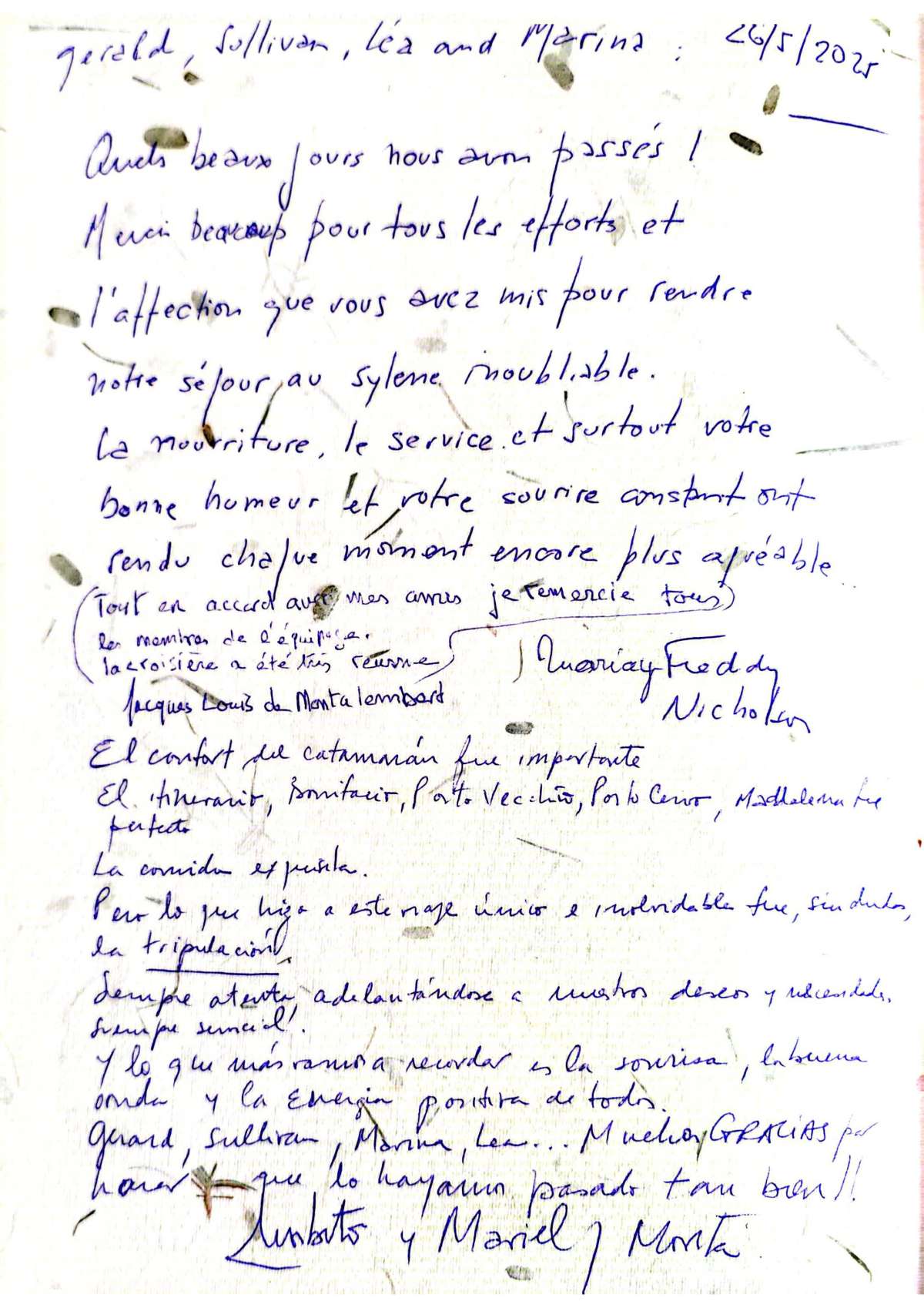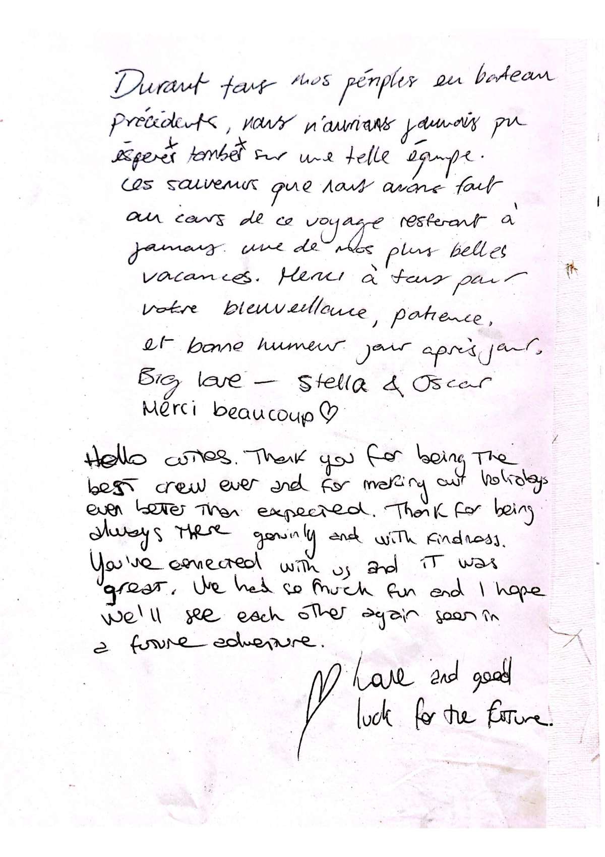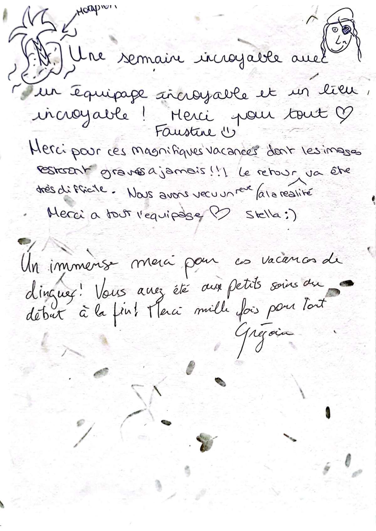 Merci pour ces magnifiques vacances dont les images resteront gravées à jamais!!! Le retour à la réalité va être très difficile. Nous avons vécu un rêve. Merci à tout l'équipage.