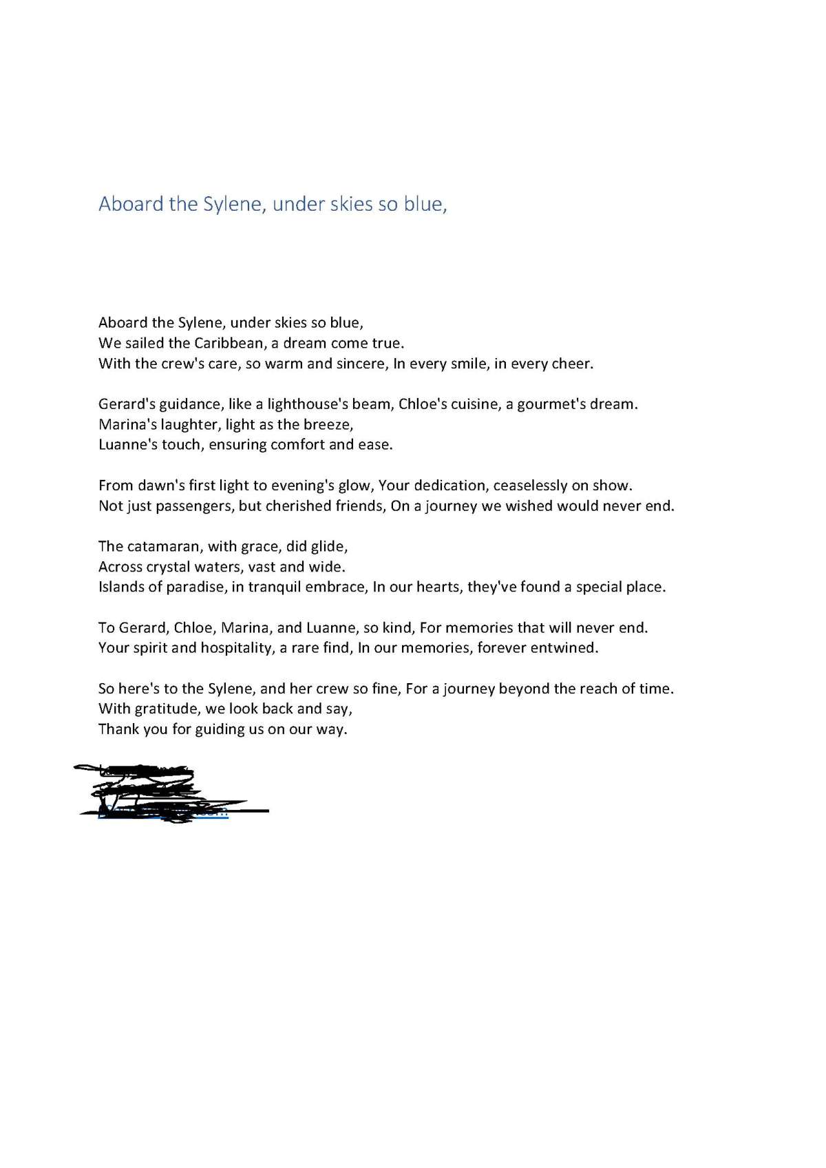 Vous avez fait de cette croisière un moment spécial gravé à jamais dans nos mémoires.