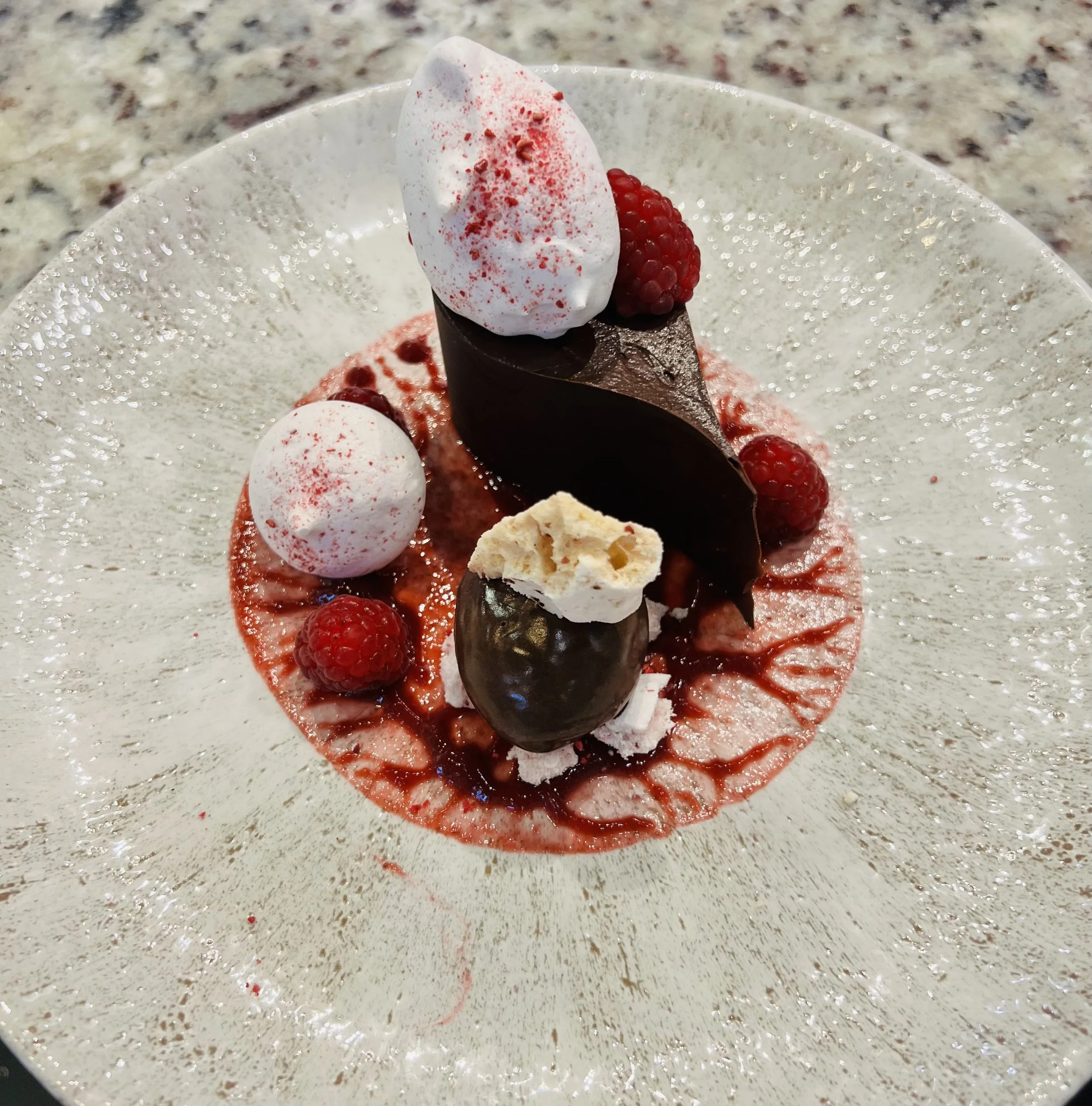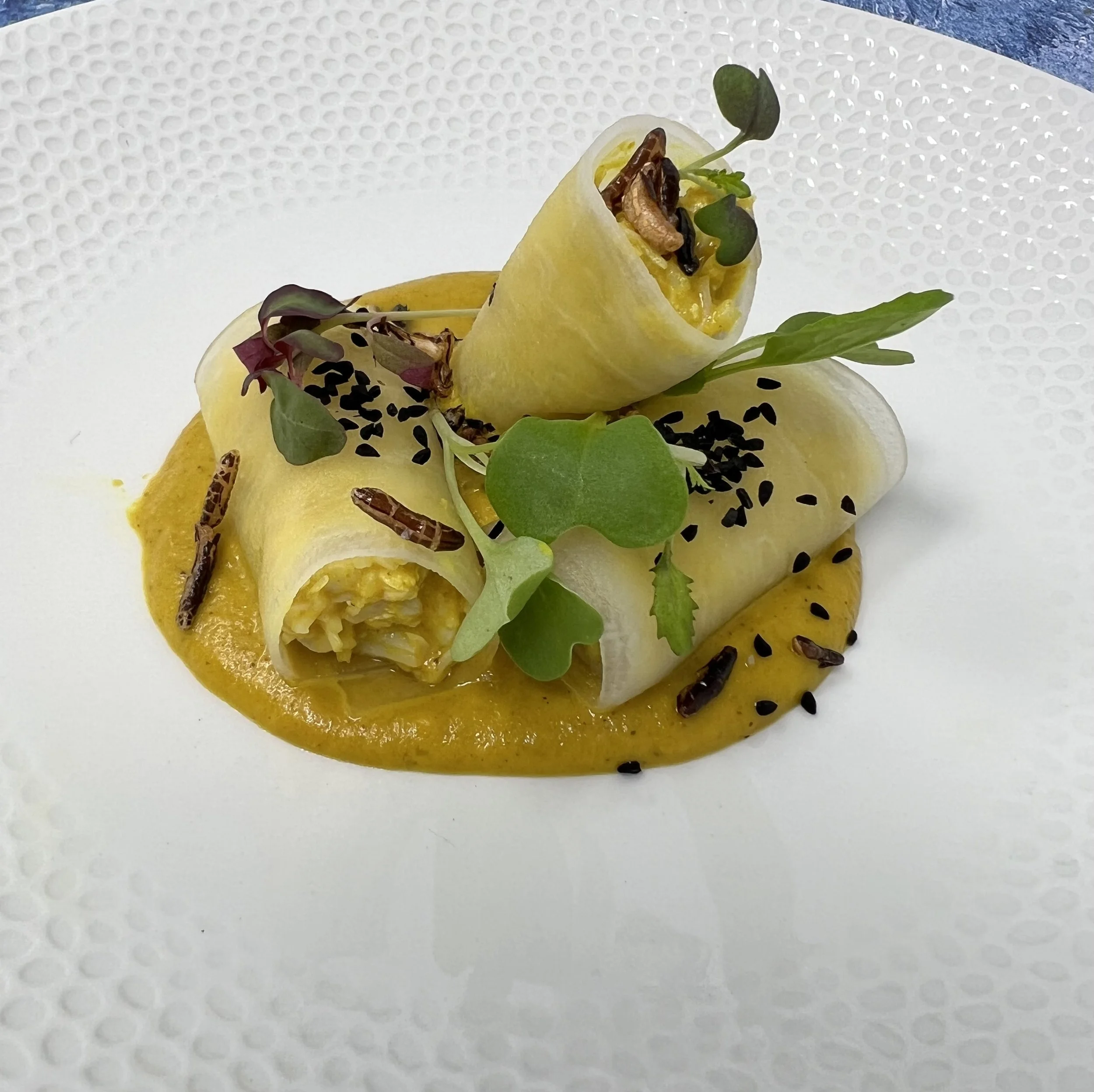 With cauliflower purée and Indian curry foam.Moroccan Chicken & Pistachio Boudin
