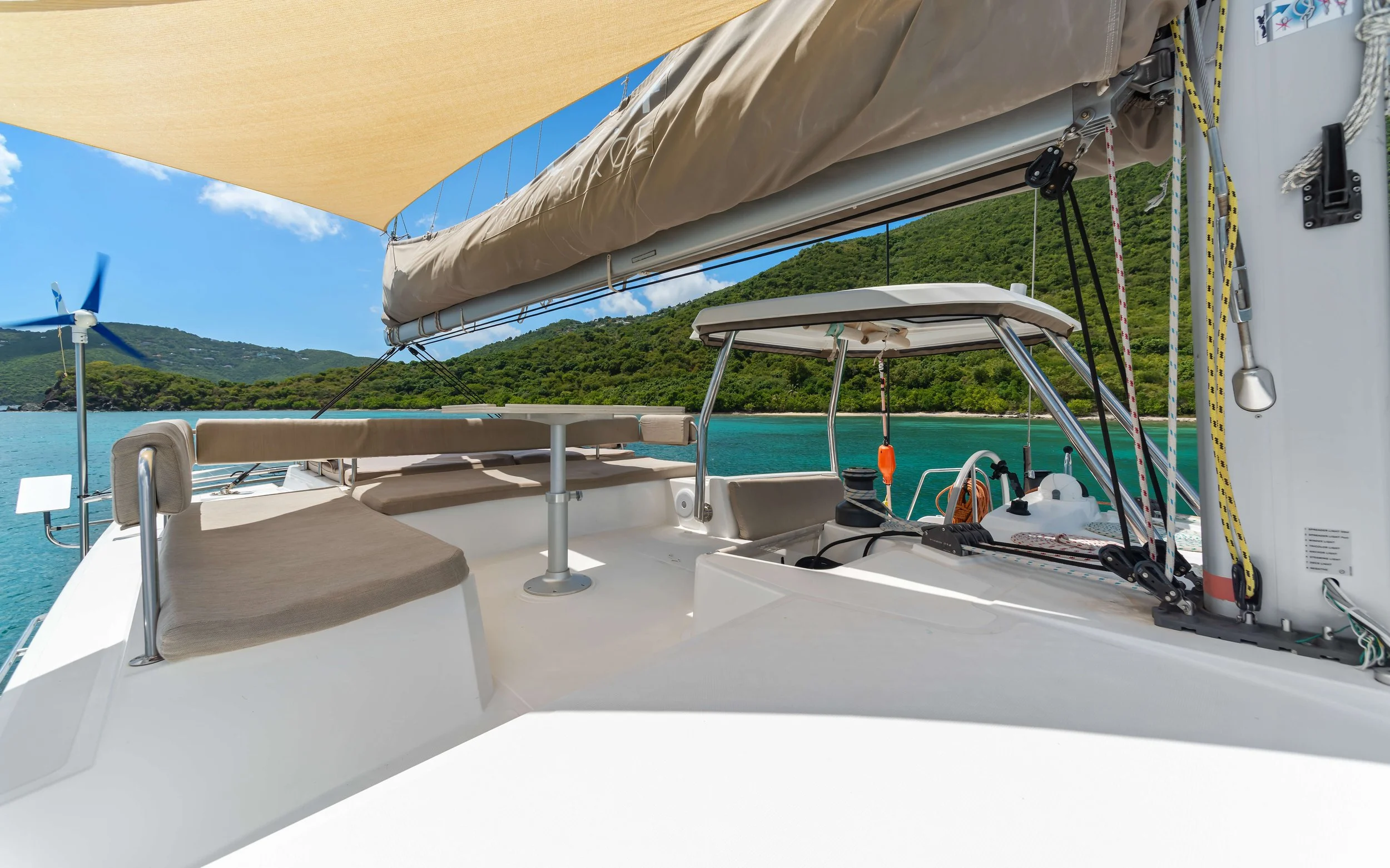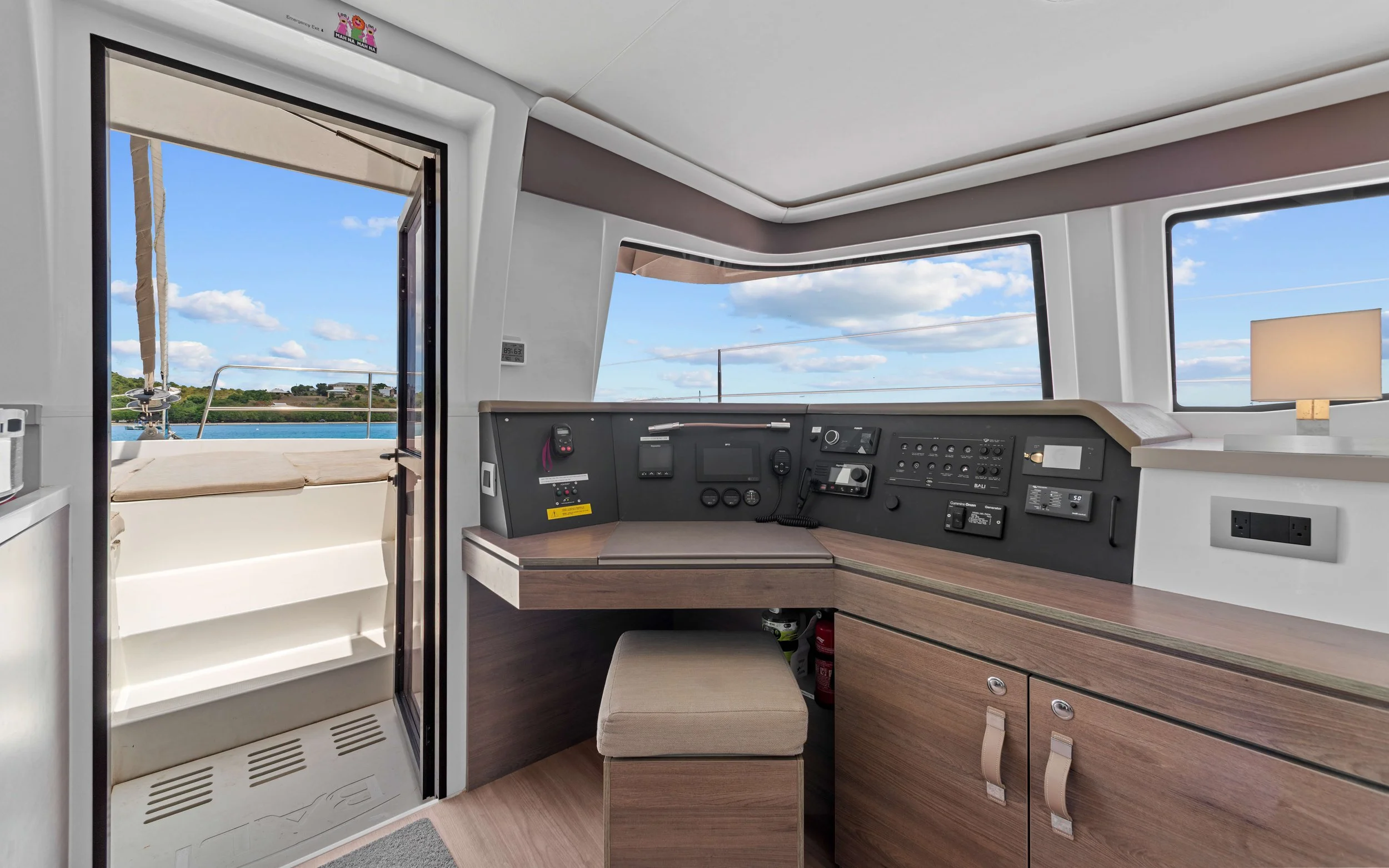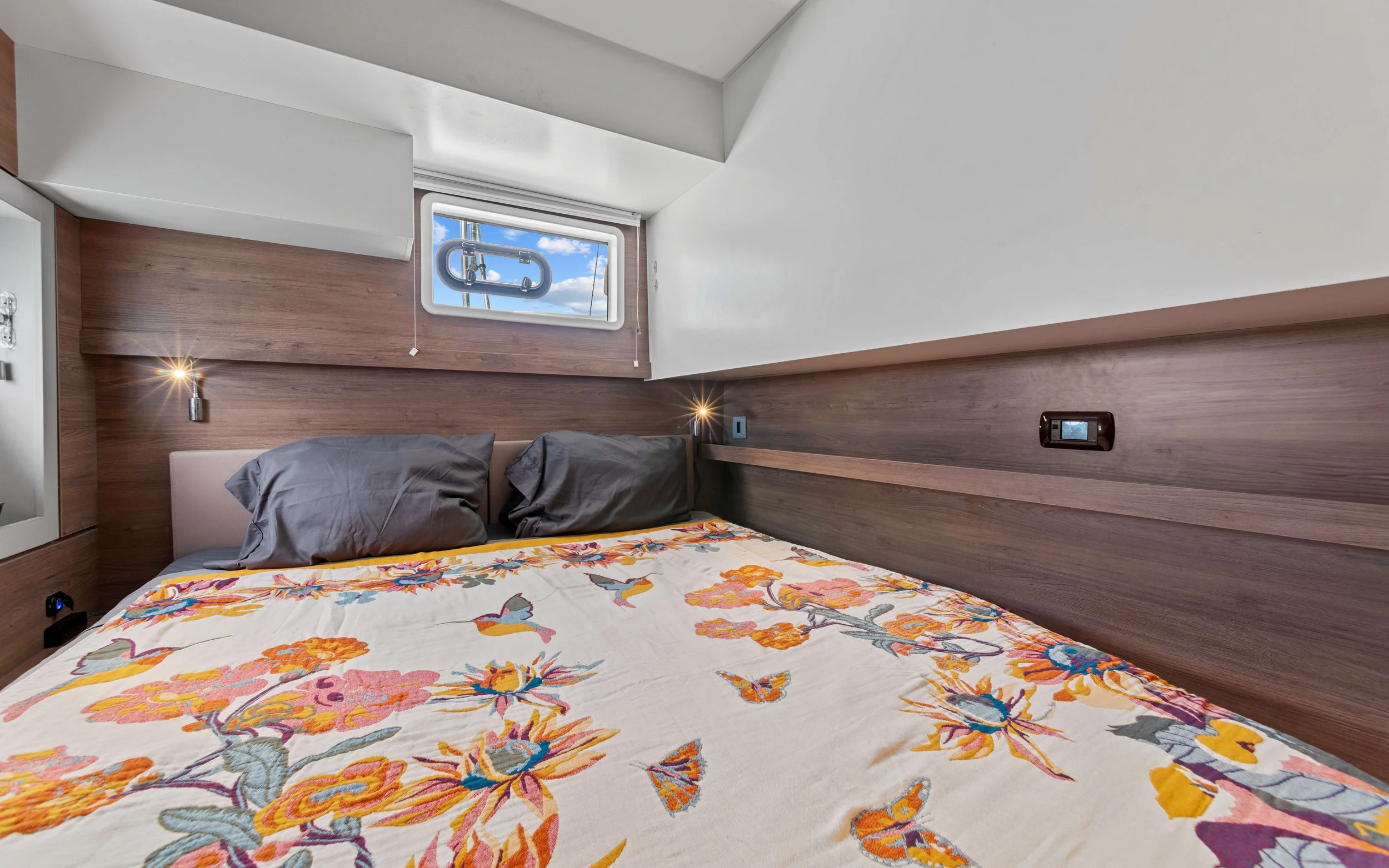 The interior boasts a spacious “L”-shaped galley, a forward-facing chart table, and a large, refined salon area with seating for 8–10. Outfitted with the stylish “Pack Elegance” décor, guests can unwind in plush club armchairs or stretch out on the lounge. Each queen cabin is thoughtfully designed with modern finishes, generous storage, and a private bathroom complete with shower and toilet—making this yacht a luxurious home at sea.