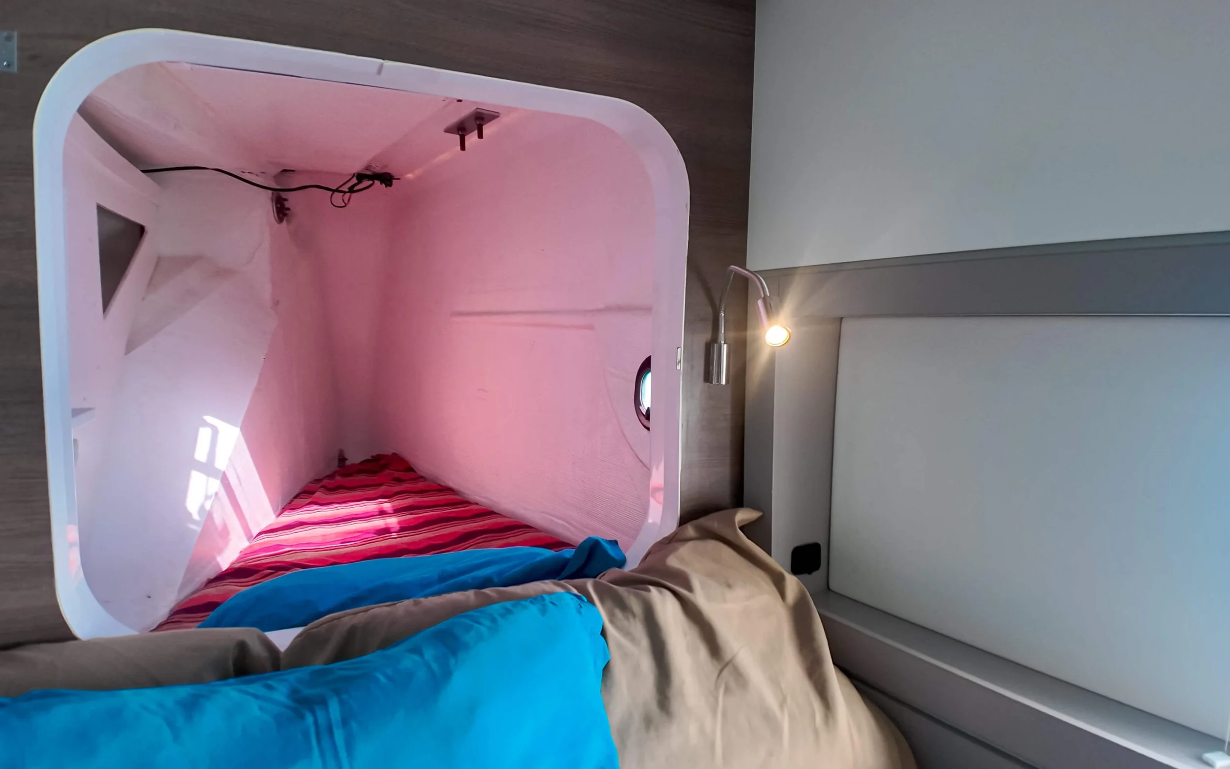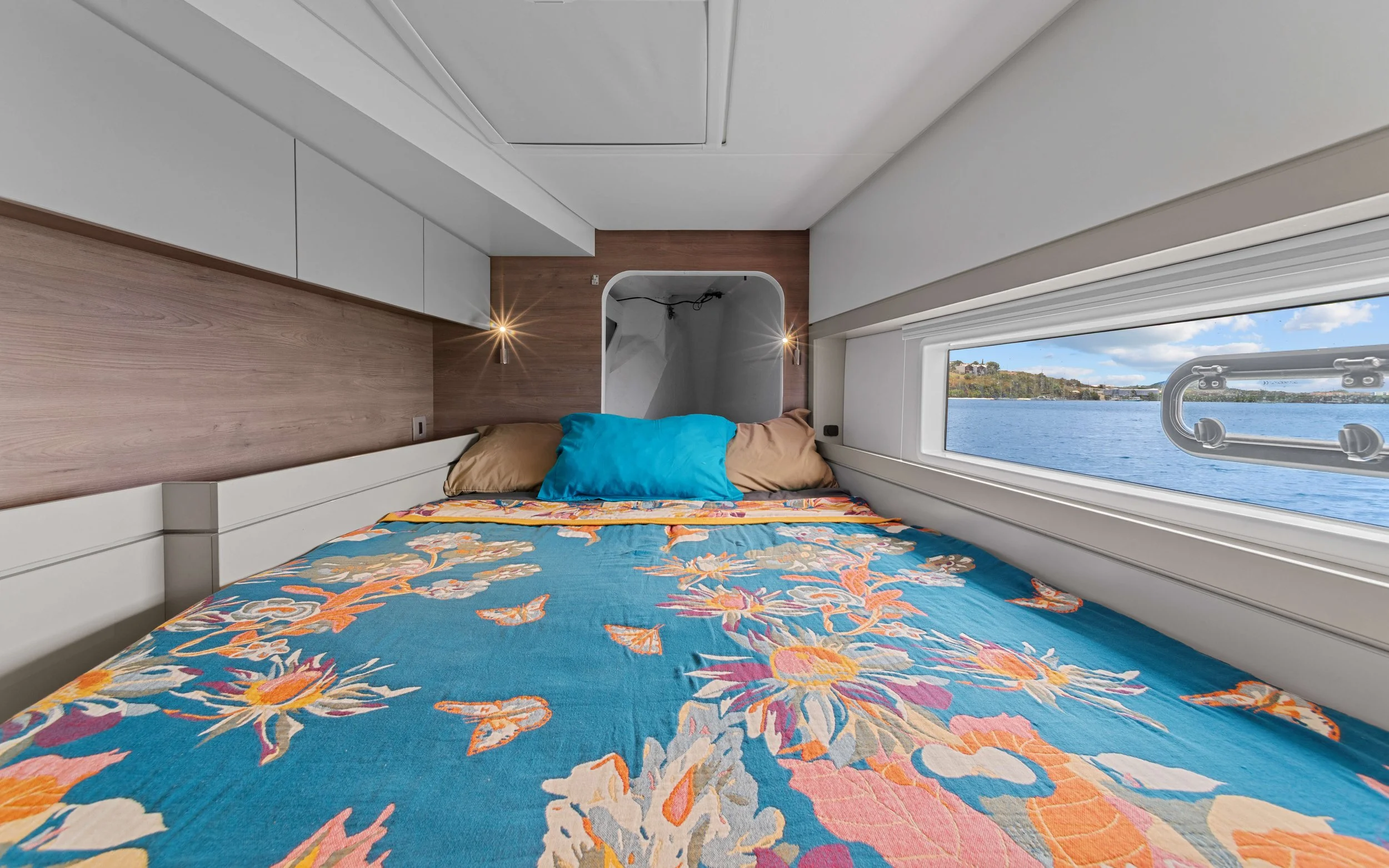 For family or group charters, Mah Na Mah Na offers two additional forepeak berths, each suitable for a child or young adult. These compact spaces include shelving, outlets, and twin-bed-sized mattresses, and are accessed via adjoining cabins. Forepeak berths are intended for use by children, teens, or young adults who don’t mind sharing a more open, communal-style space with those in the connected cabin.