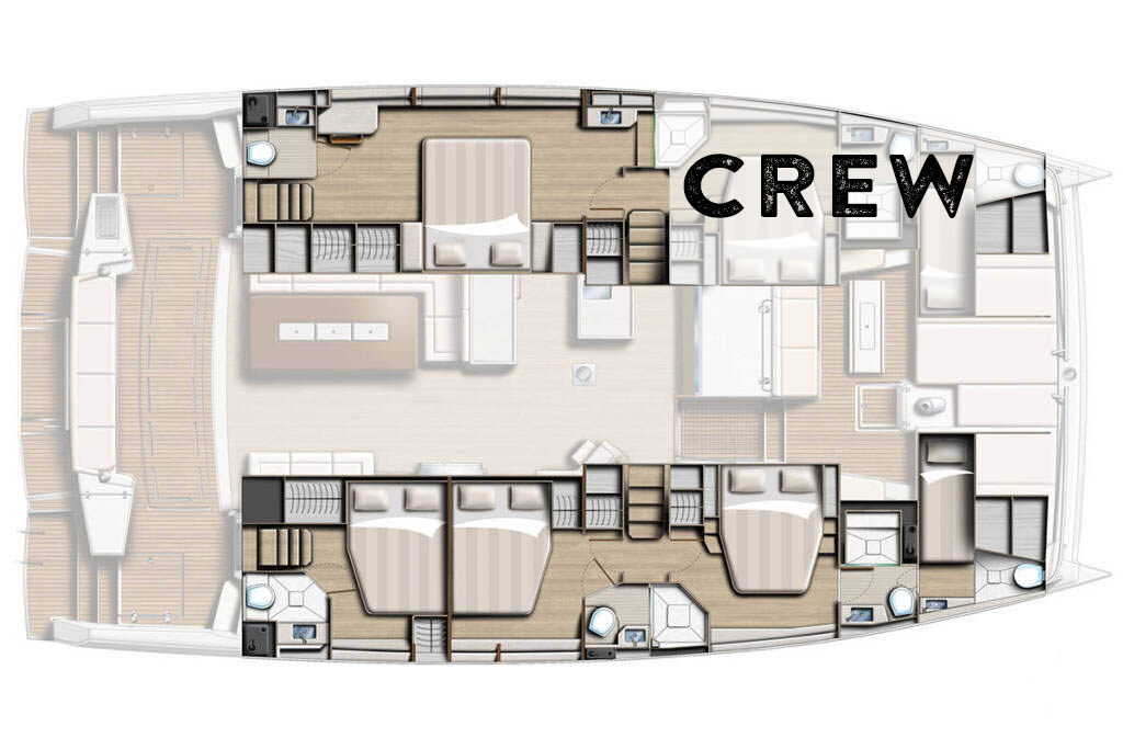 Chill in the flybridge’s cushioned lounge areas, enjoy alfresco meals at one of two or three dining areas, or step down to the hydraulic swim platform for an easy dip into the Caribbean blue. A watermaker, freshwater purification system, and a 615–735 L fridge/freezer with chilled water and an ice maker ensure every onboard moment is as refreshing as the last.