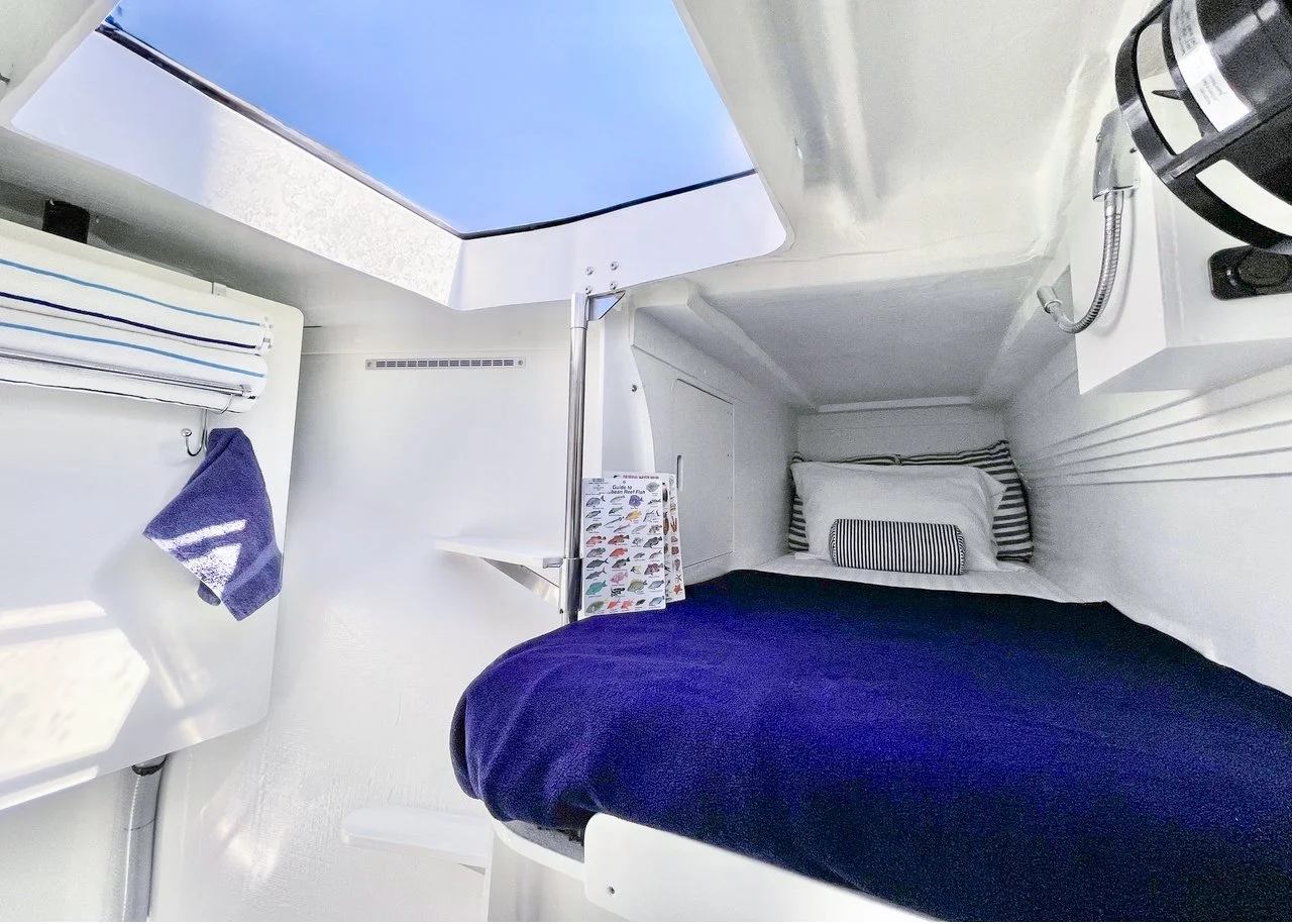 Designed with both functionality and indulgence in mind, CHILLIN’ HUT features a spacious owner’s suite with a walk-around bed and three additional queen cabins—each with its own ensuite freshwater electric flush toilet—plus a compact, yet thoughtfully designed, forepeak berth that’s perfect for a young adult or a solo traveling friend. Altogether, the three-level layout comfortably accommodates the crew and up to 8–9 guests.