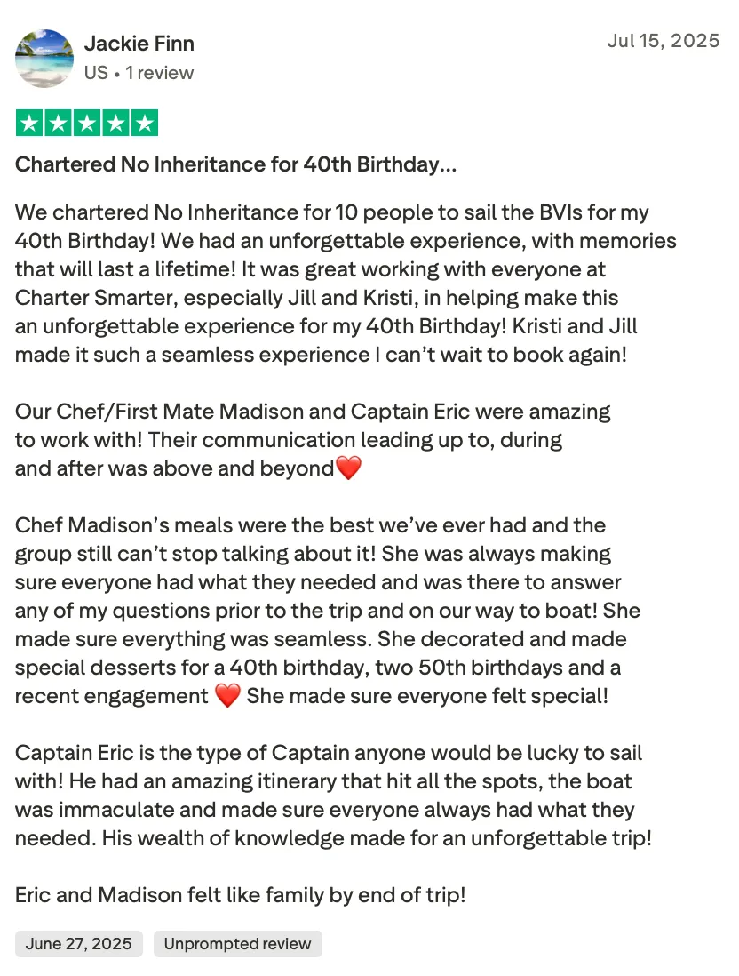 This upcoming charter season, Chef Madison will be onboard Yacht Heavenly, bringing her calm energy and refined style to guests exploring the Virgin Islands. Her craft reflects exactly what Charter Smarter stands for: genuine hospitality, attention to detail, and experiences that linger long after the anchor is lifted.